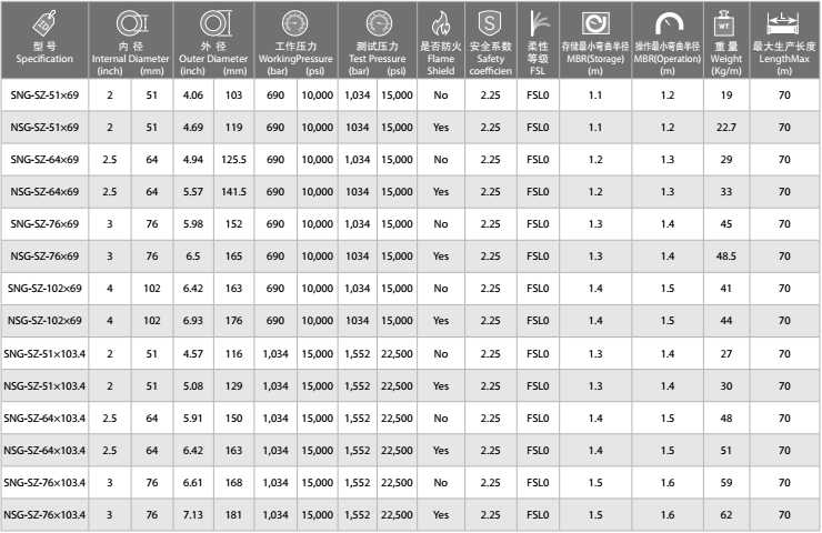 • 防火要求: 普通结构软管满足 SR6A 普通防火等级要求,5 分钟 704℃;软管外部可以根据要求增加防火阻燃层(玻璃纤维防火层),满足 SR6B 高级防火等级要求,30 分钟 704℃