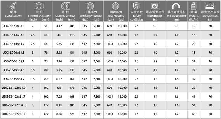 • 软管结构: 采用工程塑料作为内密封层;采用以氢化丁腈橡胶为主体的耐油、耐腐蚀、耐高温、耐气体渗透的合成橡胶为内胶密封层;高强力织物布为内缓冲层和外防护层;以高强度钢丝绳作为承压骨架材料;采用以氯丁橡胶为主的阻燃、耐磨、耐油、耐臭氧老化、耐紫外线、适用于海洋环境的合成橡胶为外保护层